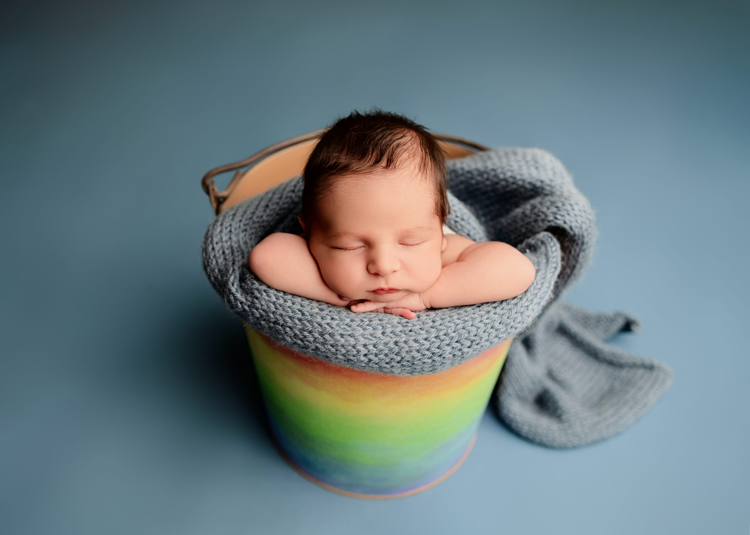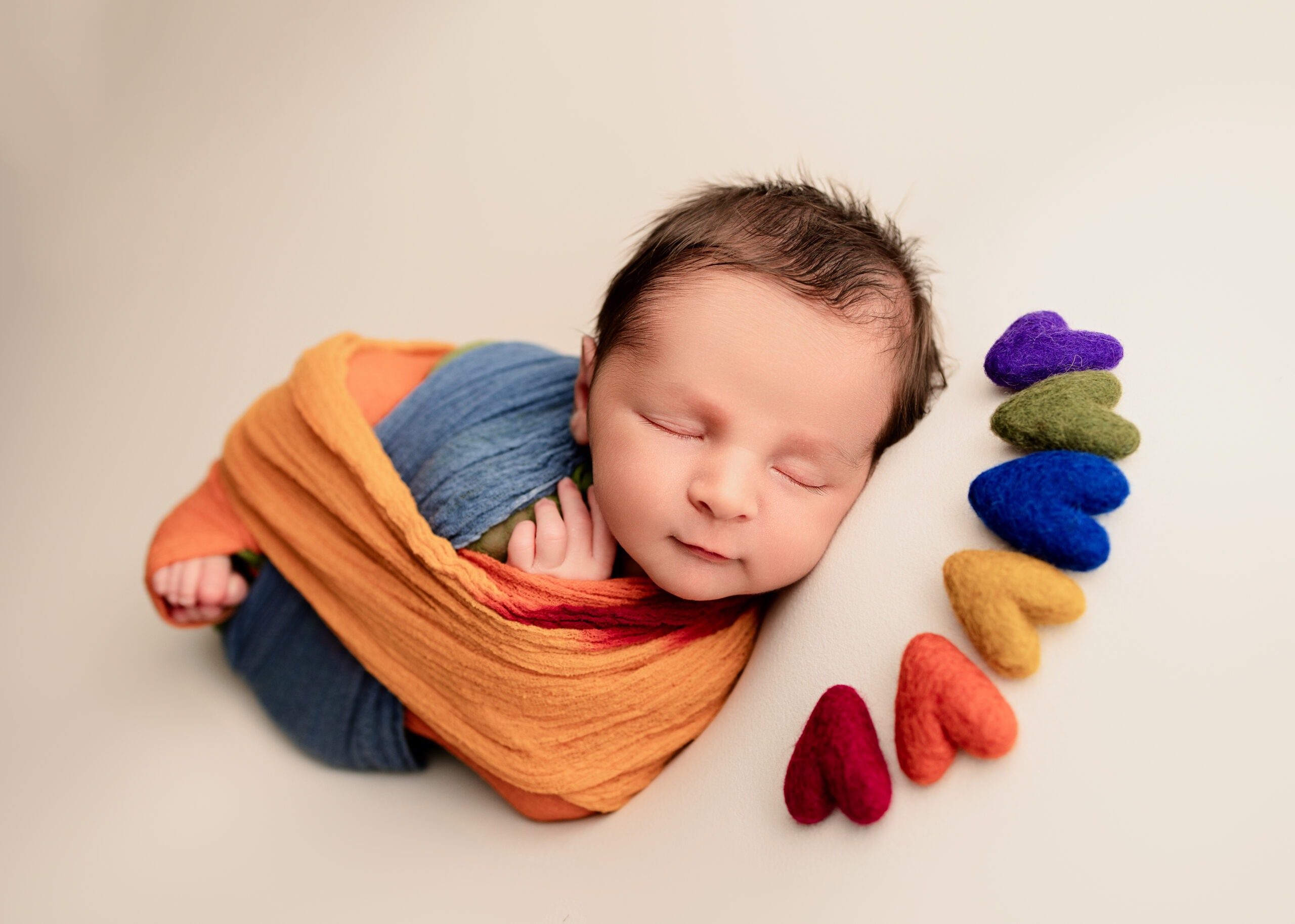 This sweet baby boy was also a rainbow baby, so of course I wanted to honor this family’s journey. I knew it was important to do this in a way that again was very simple but also showed the emotion behind it. I posed him in a cute little rainbow bucket, simply added some delicate felt hearts, and used a soft rainbow wrap. Each thing I used was subtle but full of meaning for this family. I am always intentional when it comes to the sentimental details and never let it look overdone.